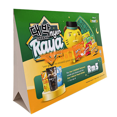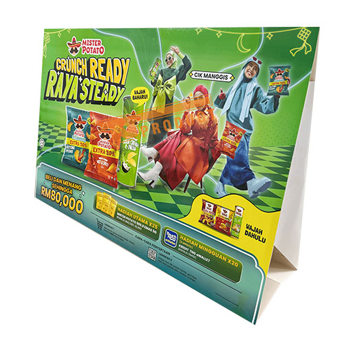 Aboards are signs that function as mini billboards, often printed in full color to maximize their visual impact. Made from foldable printed cardboard, an Aboard is a self-standing display unit designed to sit on flat surfaces like tabletops. Though compact, Aboards are highly effective, especially when placed in high-visibility locations such as co-working desks, restaurant tables, bar tops, or hotel room counters.